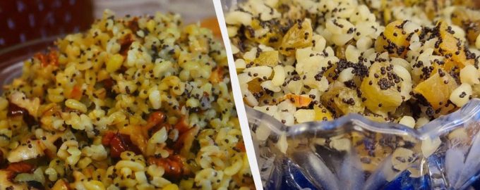Clătiți bulgurul de mai multe ori, turnați apă și fierbeți timp de 15 minute la foc mic. Lăsați bulgurul să se răcească sub un capac. Se toarnă apă clocotită peste sultaninele și semințele de mac timp de 30 de minute și se toacă nucile în bucăți mici. Se macină semințele de mac cu un blender sau un mortar. Se amestecă apoi terciul cu mierea și restul ingredientelor.