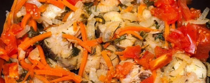 - Se încinge ulei vegetal într-o tigaie la foc mediu, se pune ceapa și se prăjește până se înmoaie, se adaugă morcovii, ardeiul gras, piperul negru măcinat, sarea și se prăjește încă 3-4 minute, se pun bucățile de pește, se sărează și se gătește încă 10 minute amestecând constant.