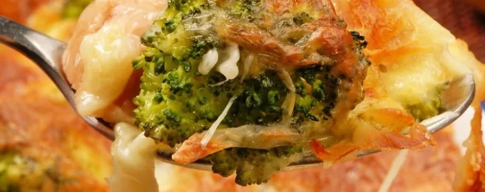 Pregătiți o caserolă sănătoasă în care broccoli se combină armonios cu peștele roșu, iar umplutura de ou și smântână va face vasul fraged și suculent.