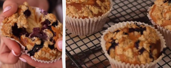 Preîncălziți cuptorul la 180 ℃. Într-un bol, adăugați ouăle, iaurtul grecesc, untul topit, laptele, zahărul alb și brun. Bateți la viteză mică până la omogenizare. Se cerne făina, sarea și praful de copt. Contini să amestecați bine până când toate ingredientele sunt combinate. Se încorporează ușor afinele. Se întinde alul în forme. Se amestecă toate ingredientele pentru toppingul de crumble. Se întinde crumble-ul peste alul din fiecare formă de brioșă. Coaceți în cuptor timp de 20-25 de minute.