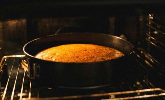 - Se unge ușor vasul de copt cu unt, se întinde aluatul, se netezește cu o spatulă.