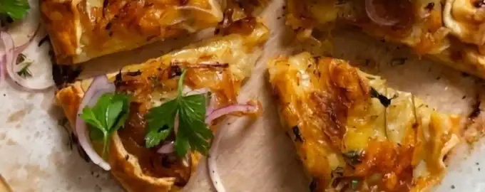 Această tartă de cartofi cu ceapă caramelizată și brânză este o sărbătoare pentru papilele gustative. Aluatul fraged, ceapa dulce, brânza cremoasă și cimbrul aromat o fac versatilă. Adăugați o salată ușoară pentru echilibru și bucurați-vă de fiecare îmbucătură.