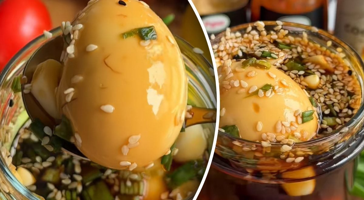 Se amestecă într-un borcan ceapa verde tocată mărunt, sosul de soia, apa, usturoiul, semințele de susan și sosul iute. Apoi se pun ouăle în marinată, se acoperă borcanul și se pune la frigider timp de 6 ore.